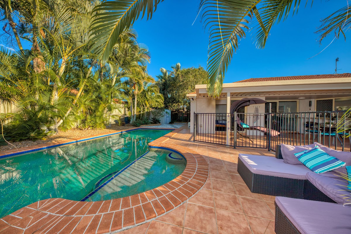 yard, this is the perfect place to unwind. The pool is bordered by lush tropical gardens and will feel