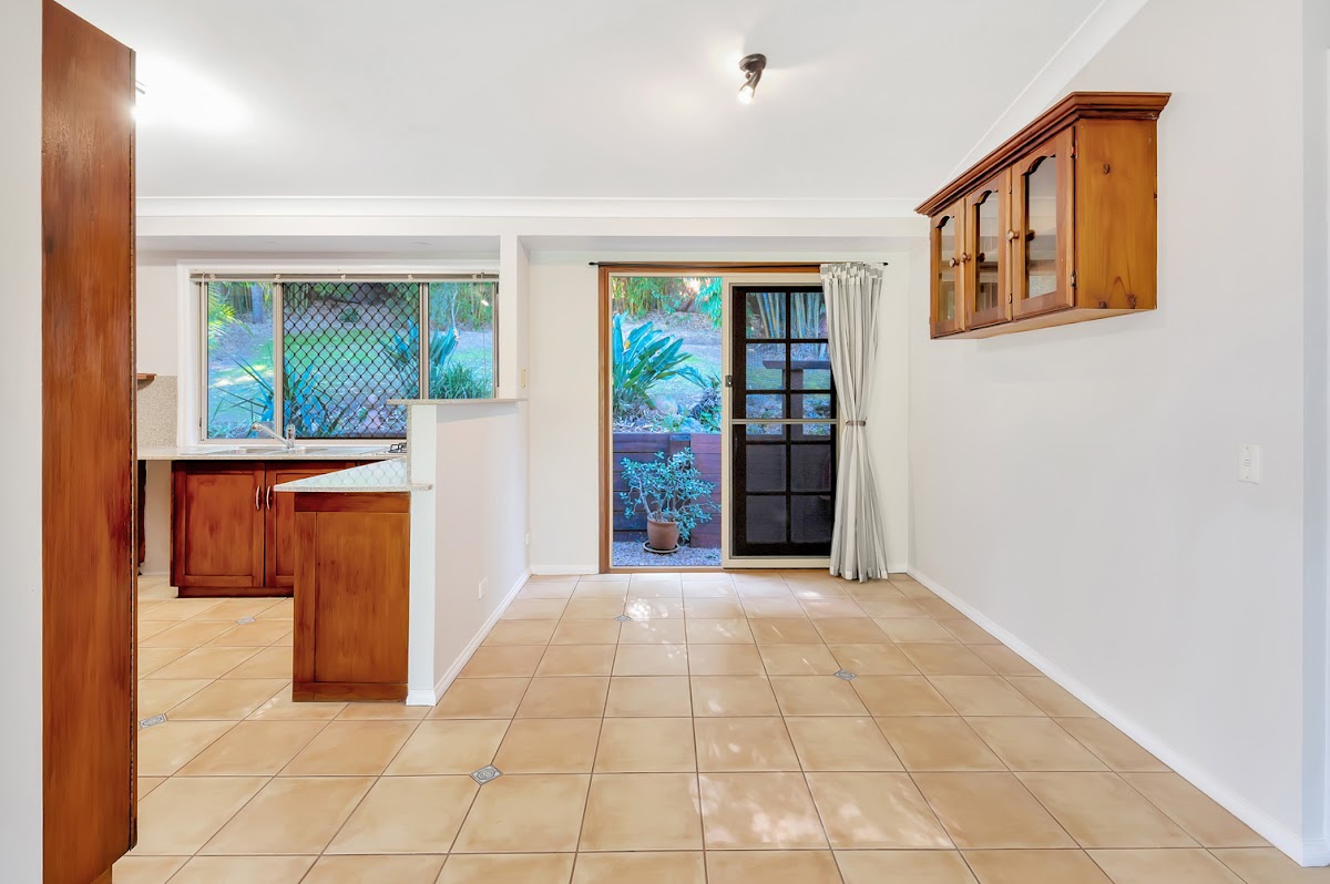 Upstairs, the tiled living area is open plan, and with double French doors that open out to a wide covered deck that runs the length of the house – relaxed, outdoor living is easy. The kitchen, with gas cooking and plenty of storage, looks out to the back garden where a lawned terrace and mature gardens imbue a tropical feel. This level also has 3 bedrooms that feature bay windows, 1 with a picture window, ceiling fans and built-in robes; as well as the laundry and family bathroom.