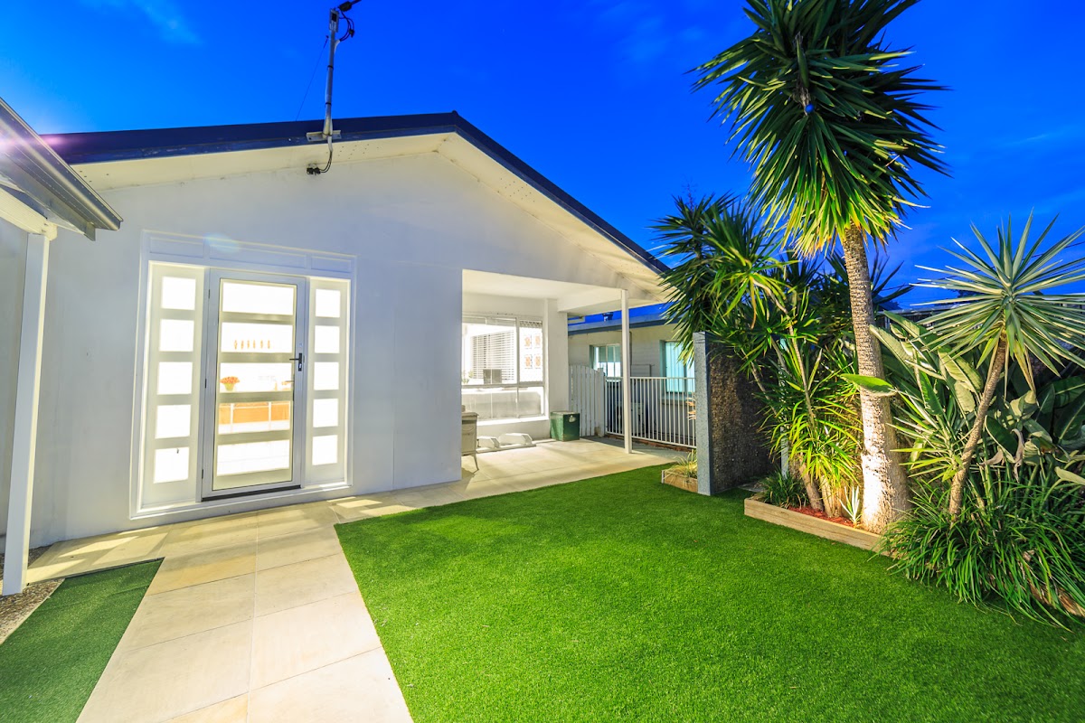 Lush tropical gardens with low maintenance superior artificial turf, putting green and cubby house