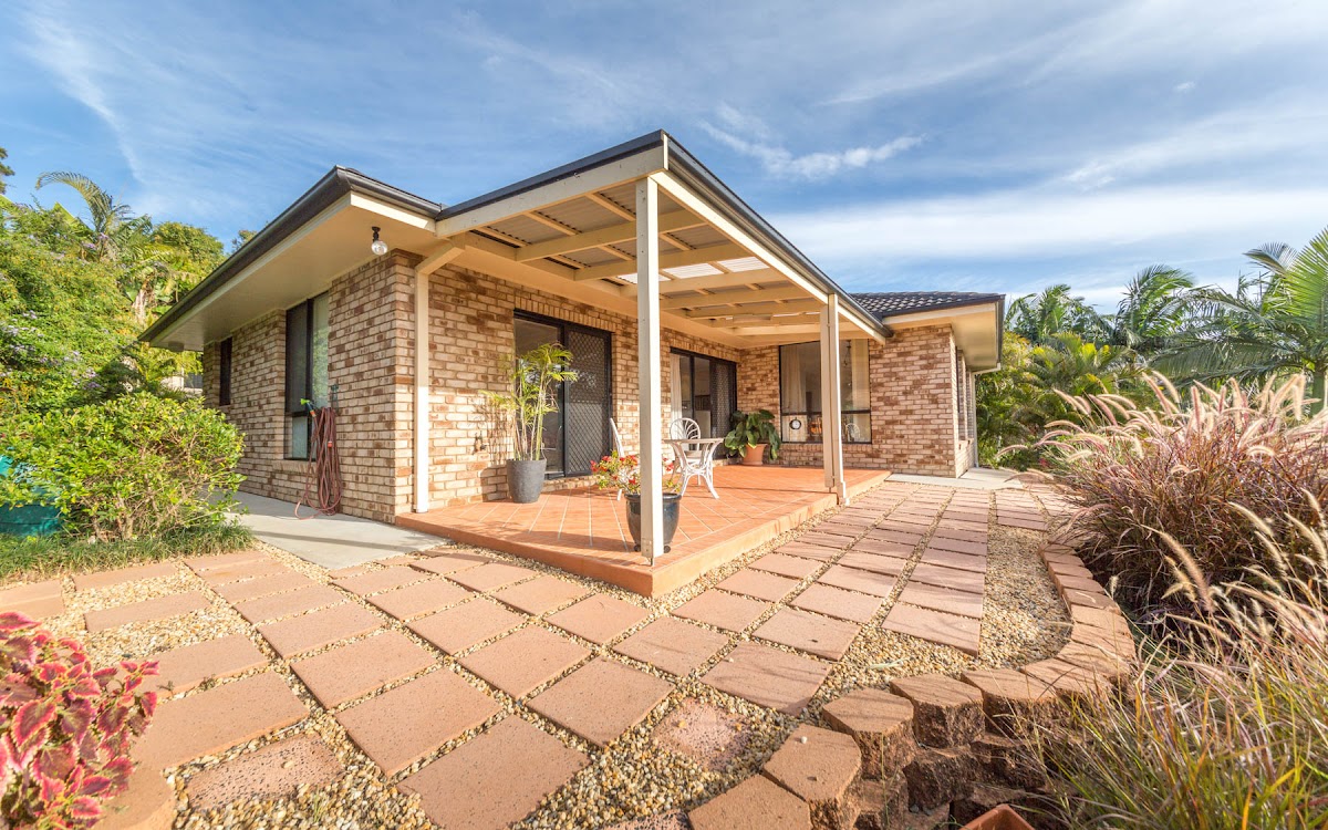 The peaceful covered out door entertaining area captures the lovely winter sun and is nessled amongst the established tropical gardens.