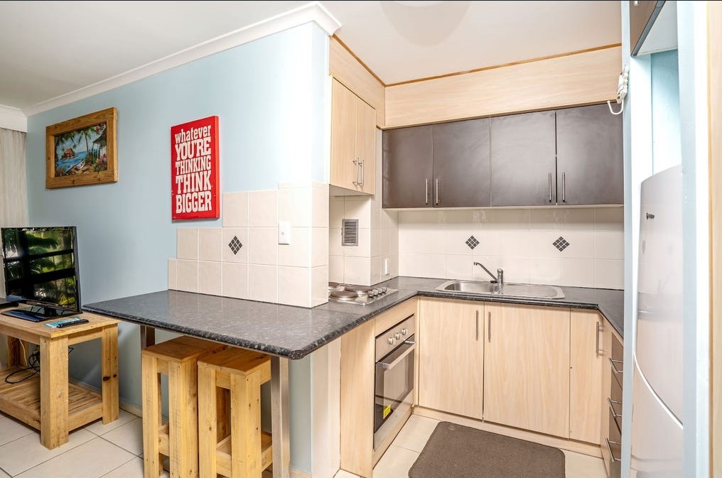 The spacious open-plan living area includes a modern kitchen with stainless steel appliances and a breakfast bar. The light-filled master bedroom is air-conditioned, and the large bathroom also includes laundry facilities.