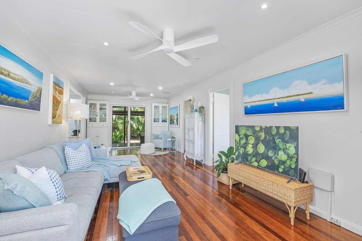 Freshly painted inside and out, the interiors feel light, breezy, and welcoming, perfectly complementing the coastal atmosphere. French doors open effortlessly onto enchanting decks and garden surrounds, enhancing the strong indoor–outdoor connection. Security mesh doors provide peace of mind while allowing controlled airflow, complemented by aluminium windows and ceiling fans throughout.