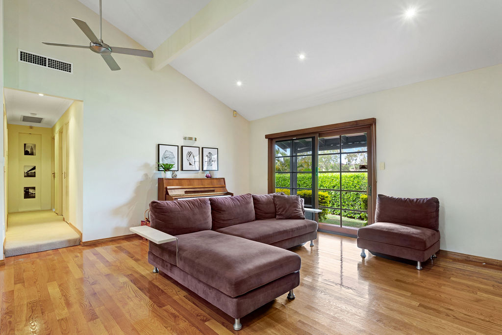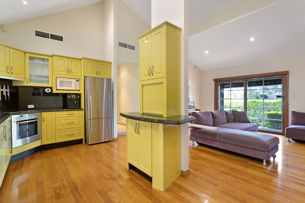 * Open plan living/ dining and kitchen under high cathedral raked ceilings with warm timber floors.