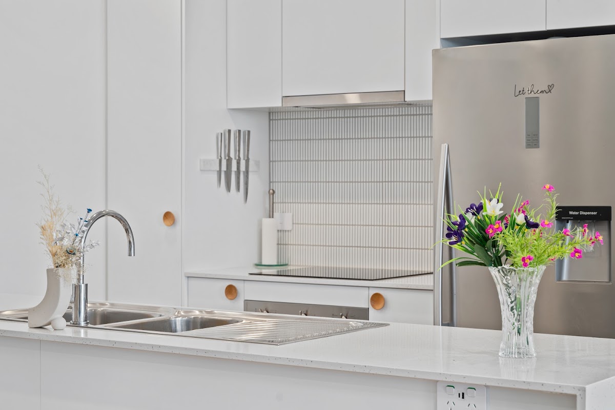 At the heart of the home sits a thoughtfully designed kitchen finished with elegant waterfall stone benchtops, quality SMEG appliances and generous cabinetry. Whether you’re preparing a quiet meal for yourself or hosting friends, the space balances style and practicality with ease. Timber-look vinyl wrap flooring flows through the living areas, offering a stylish finish that is also durable and easy to keep clean — perfect for modern, everyday living. Sliding doors open to the spacious balcony, creating a natural extension of the living area. Accessible from both bedrooms as well as the lounge, it’s the perfect place to unwind at the end of the day while watching the sun set over the surrounding hills. Picture evenings with a glass of wine, warm light filtering across the apartment as the day fades into night.