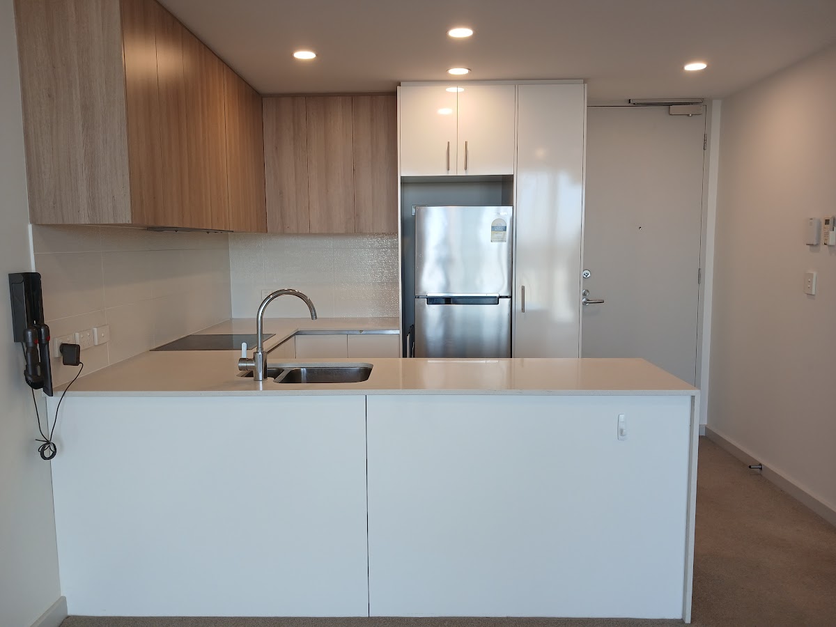 * A modern kitchen with stone benchtops, dishwasher