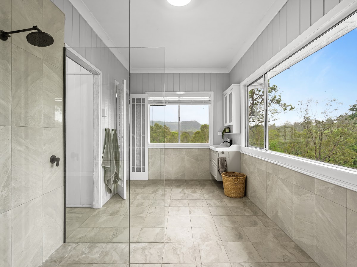 – Modern bathroom with incredible views of the surrounding mountains