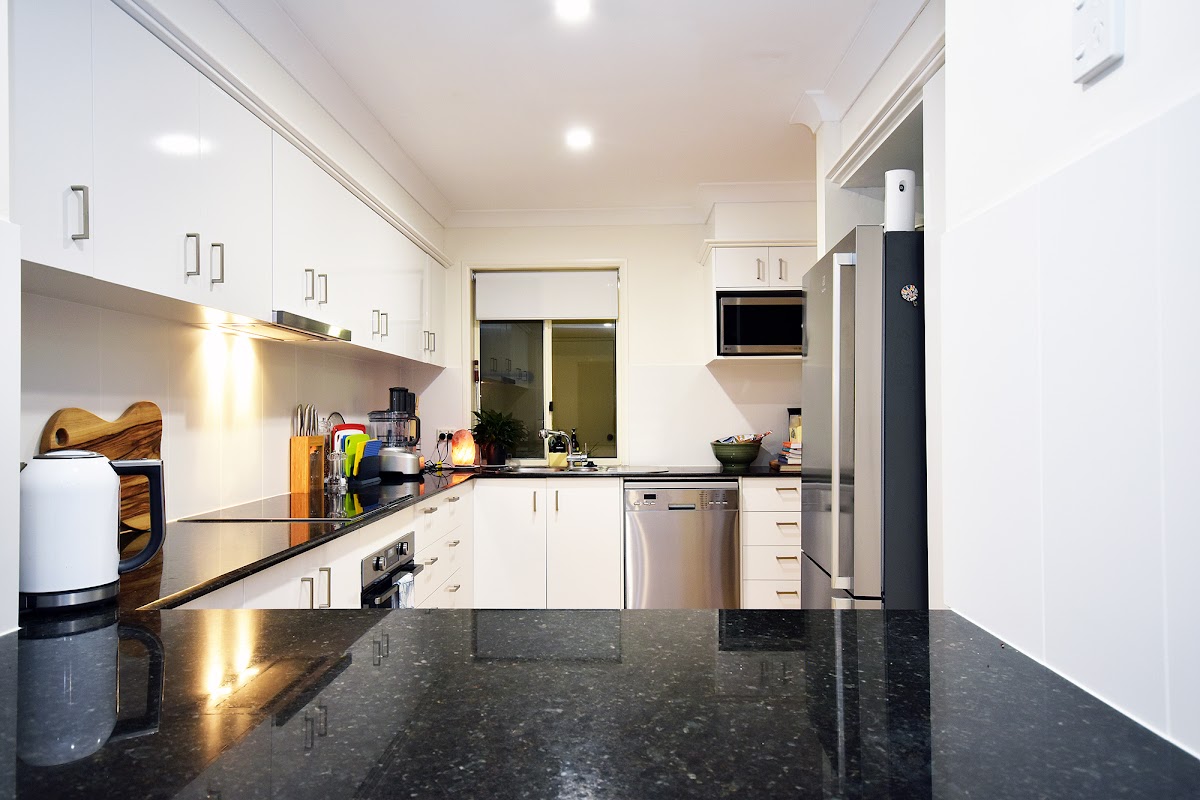 The large contemporary kitchen features extensive granite bench tops, modern quality stainless-steel appliances plus pantry.