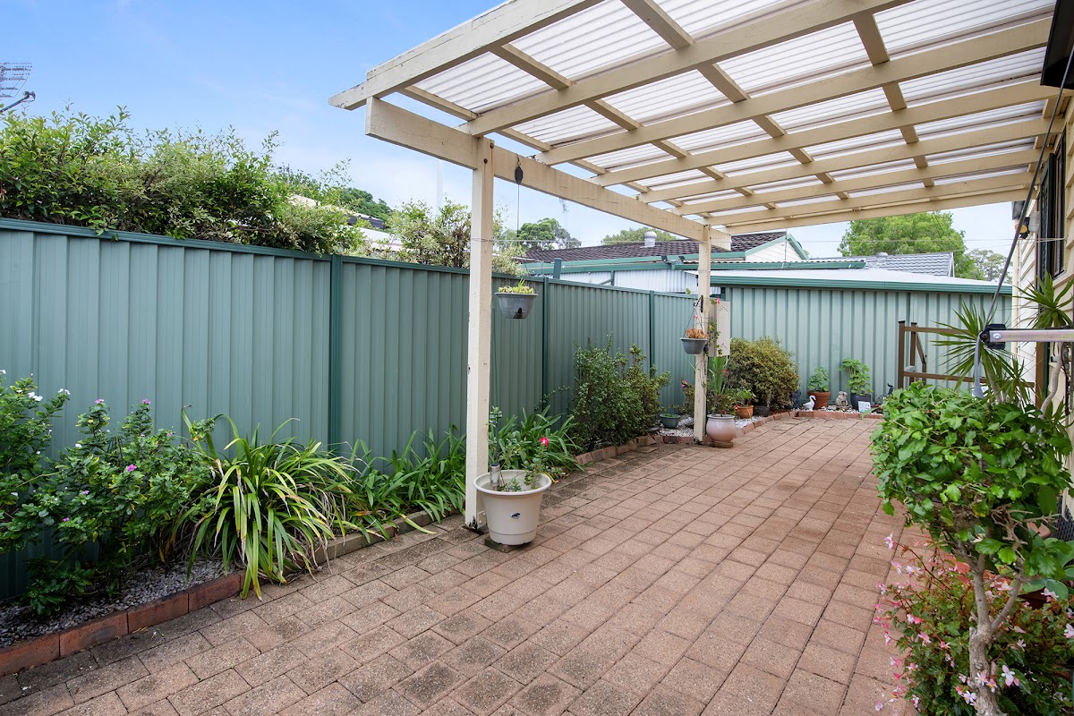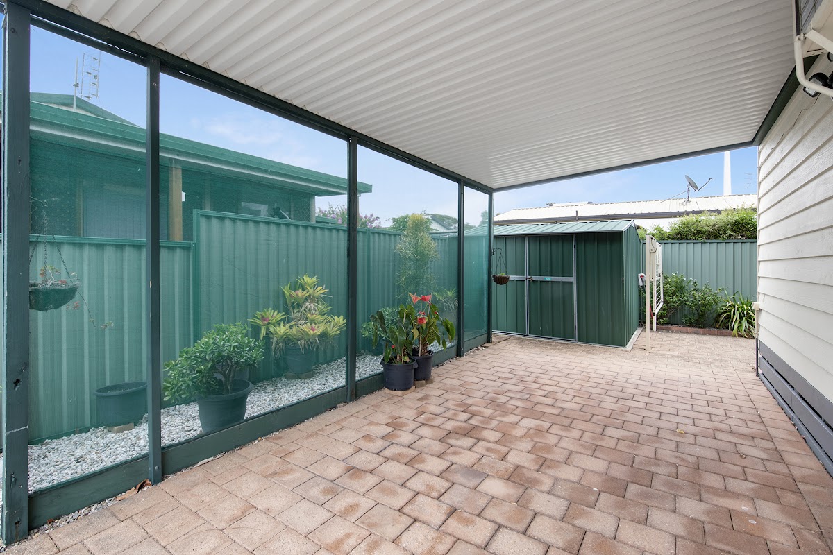The backyard is paved and does have the clothesline and garden shed with easy care garden beds which lead out to the carport area.