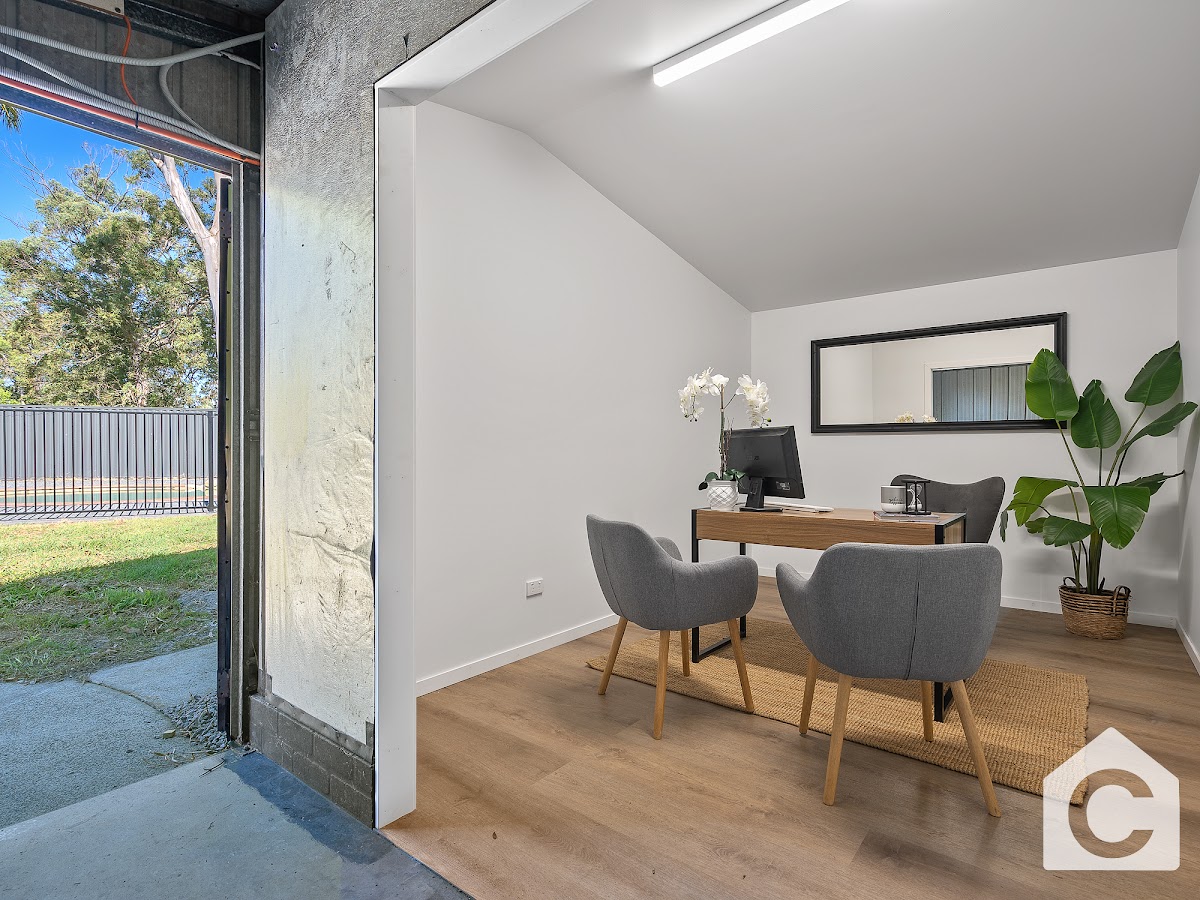 – New work from home/built in office in 3 bay shed, insulated lined and hybrid flooring