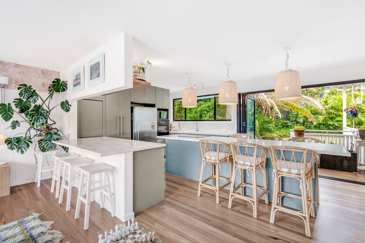 The home showcases warm timber flooring complemented by a fresh coastal colour palette, with carefully selected wallpaper and fixtures enhancing the modern beachside aesthetic throughout. The functional and stylish kitchen features Corian stone benchtops and quality Bosch appliances, including a dishwasher. Two kitchen dining bars provide flexible casual dining options, while a large stacker door opens seamlessly to the rear covered entertaining deck—perfect for hosting family and friends.