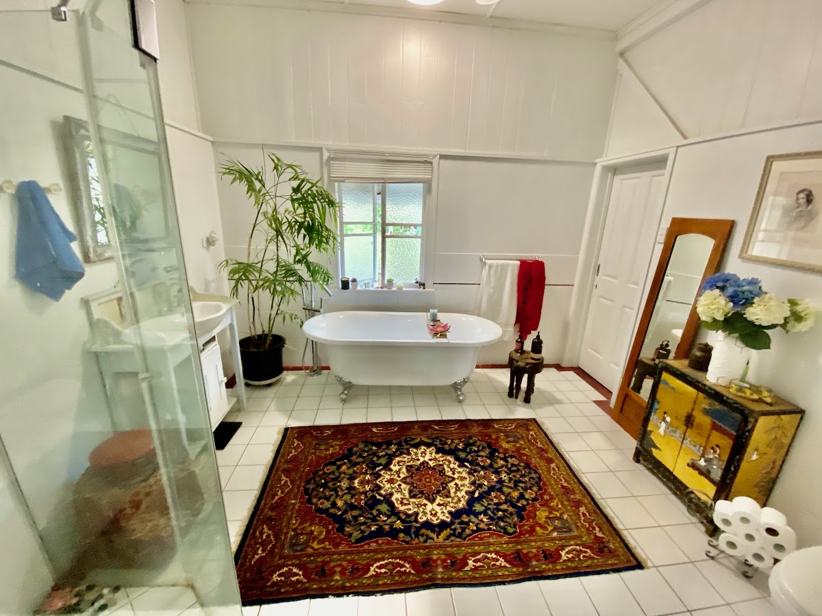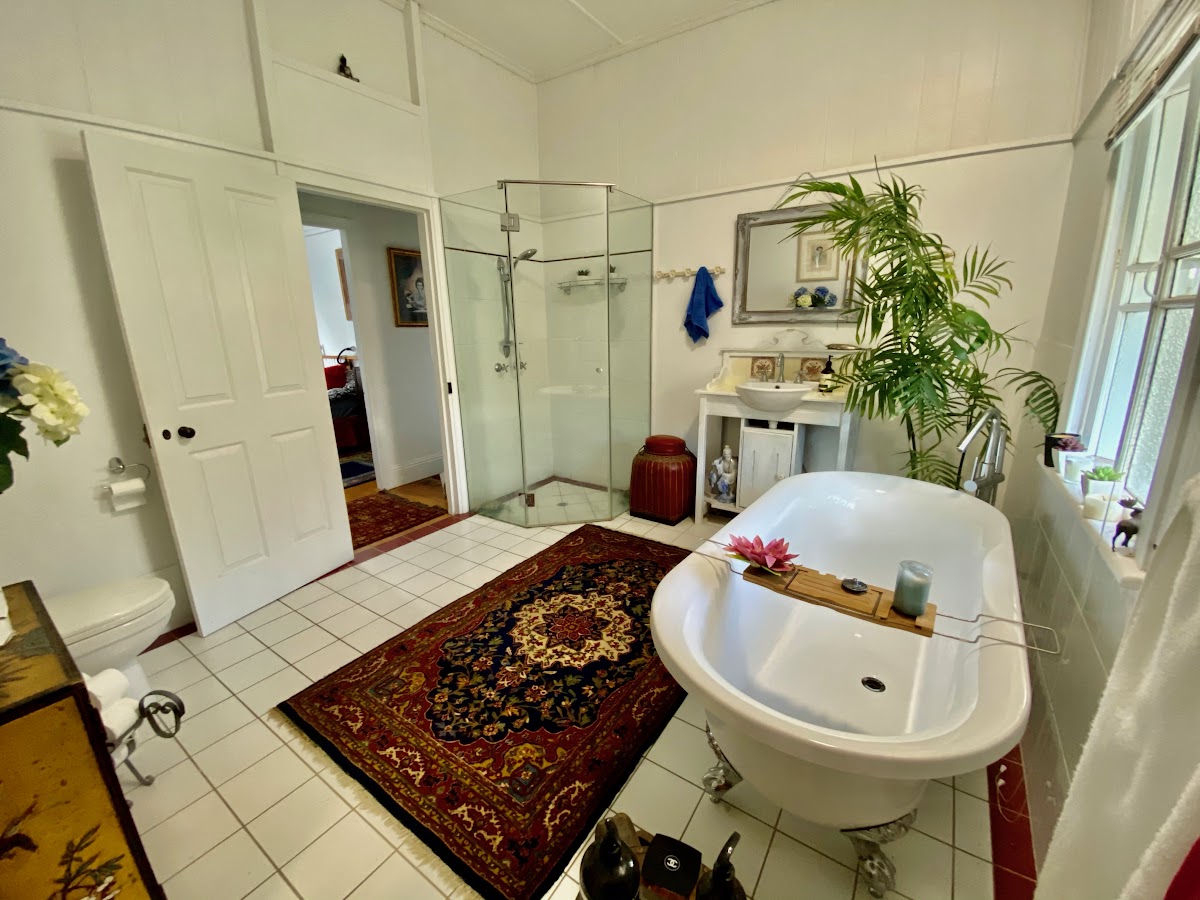 * The Bathroom is glorious , with a claw foot bathtub for soaking away the days stresses , a large corner shower cubicle, and in keeping with the theme a wash-stand style vanity