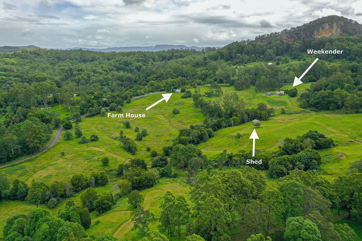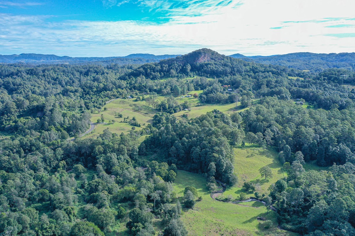 The land here at 574 Blue Knob Road is truly amazing, mainly cleared but plenty of mature native timber left across the property. Not only does it have elevation and views to the Nimbin Rocks, there is also many plateaus around the property. 4 dams are situated on the allotment with further damming potential.