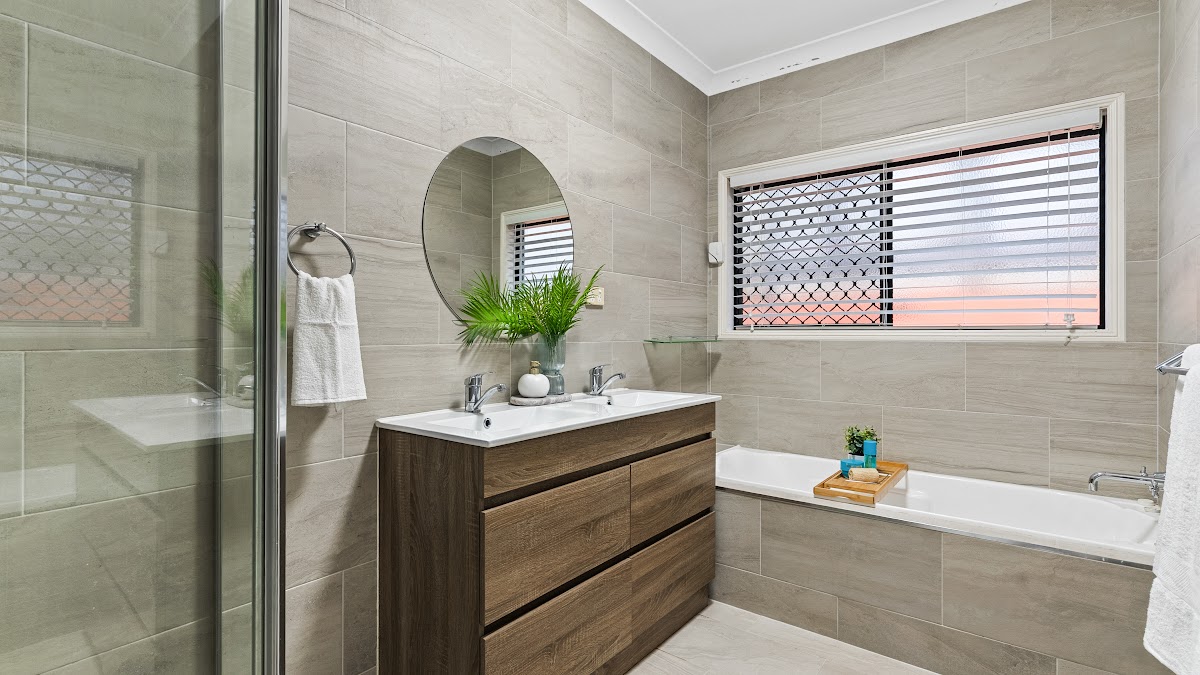 – Main bedroom is perfectly positioned for privacy with direct access to the patio and pool area, a large walk-in wardrobe with fixed shelving, and an updated ensuite with elegant tiling to the ceiling, large walk-in shower, vanity with stone benchtop and a toilet