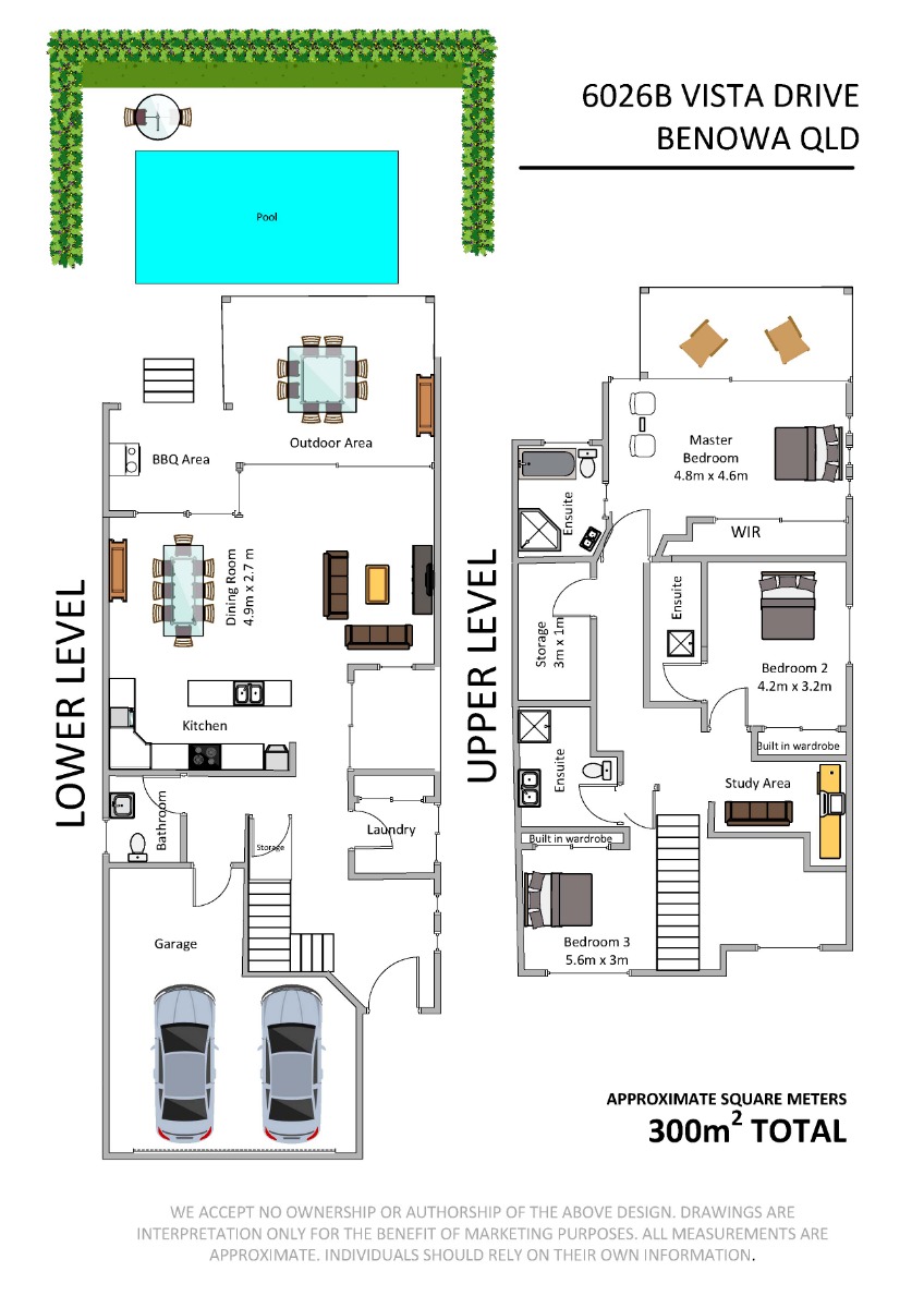 The home at 6026B Vista Drive is arranged over two levels, boasting two generous guest/children’s bedrooms both with en-suites and a substantial master suite with walk in robe and en-suite bathroom with his and her designer vanity sinks, large shower and spa bath.