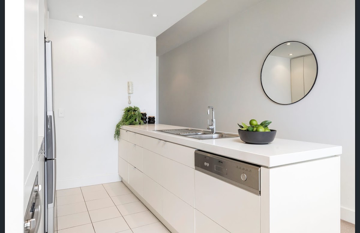 The apartment’s has two good size bedrooms, with the main bedroom having a walk-in robe and floor to ceiling windows, the second bedroom has a built-in robe. The bathroom is white and bright and includes a single vanity, generous shower, mirrored cabinets and plenty of storage space.