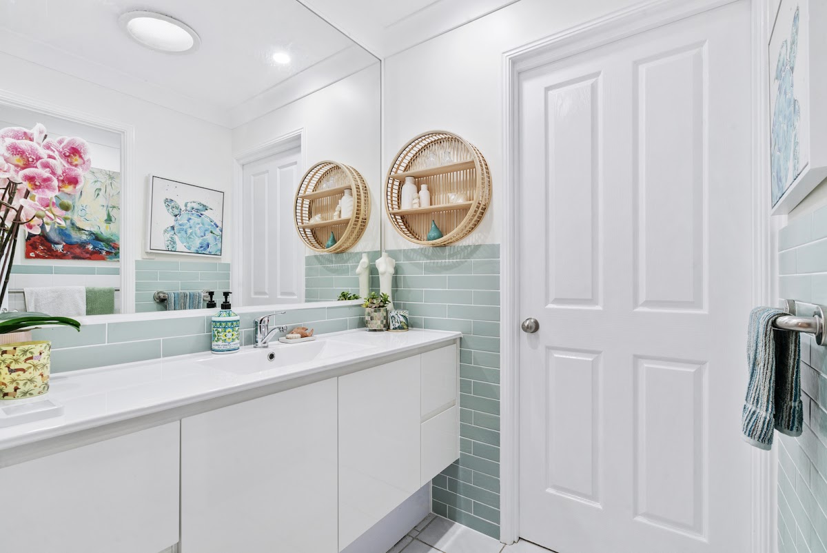 Main bedroom with ceiling fan, built-ins styled in peaceful green/sage. The second bedroom has built-ins and ceiling fans. And glass sliding door that leads out to the private under cover entertainment area. There is side access and fully fenced. The separate laundry is spacious fully lined and at the back of the tandem carport.