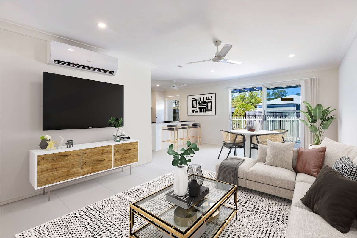 > Neutral bright and breezy air conditioned open plan living and dining area also with ceiling fans