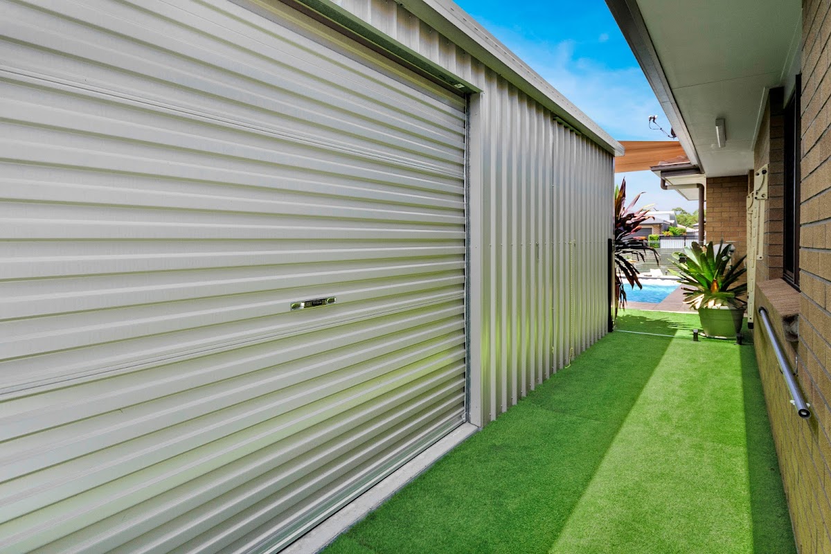 7m x 3m Colorbond shed with automatic roller door and side door access