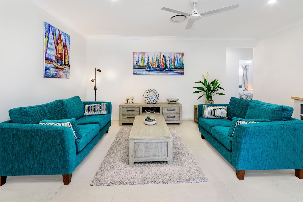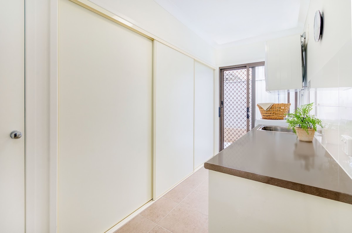 The two queen-sized rooms ensure ample space for additional family or visiting guests. These interiors are adorned with plantation shutters, ceiling fans, and plush carpets for extra comfort, while mirrored robes reflect light and elegance.
