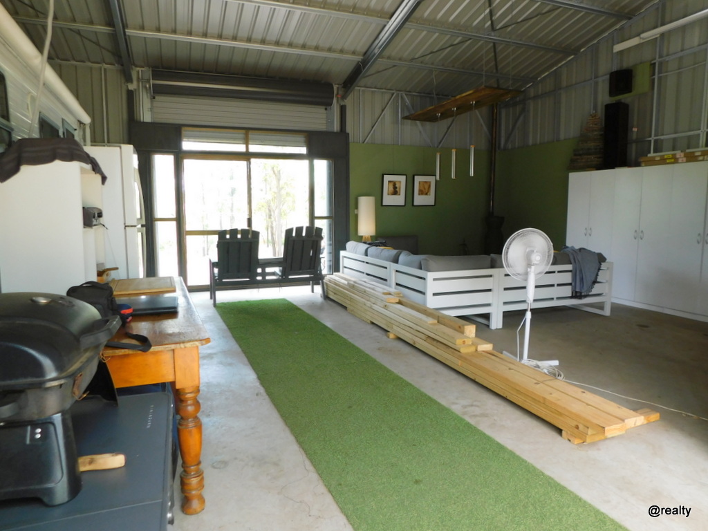 *Inside the shed the owners have made a very comfortable environment. There is a lounge area with pot belly fire place, surround sound speakers and movie screen. Lights and power points are installed.