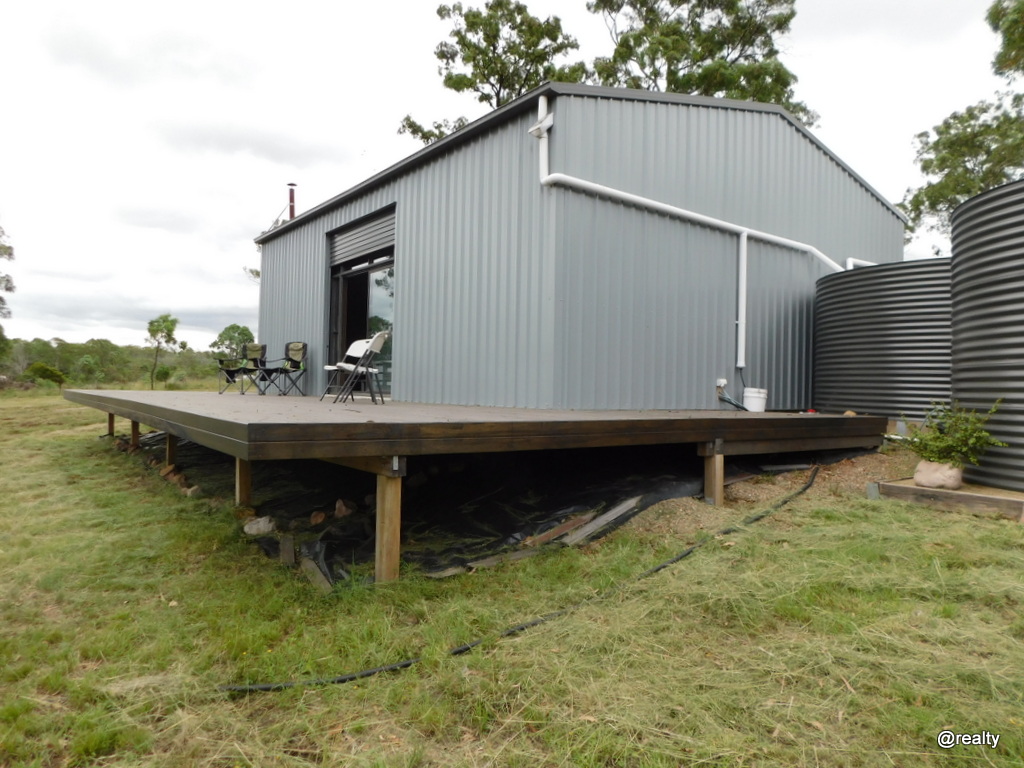 *Fully council approved 3 bay 10m x 8m colourbond shed with 2.88m clearance on roller doors. Attached to the shed is a 12m x3.8m timber deck that overlooks the land and a good size dam. The land is mostly cleared with tall ironbark and gums spotted over the block. From the front gate to the shed, the land is flat and then gently slopes away to the rear.