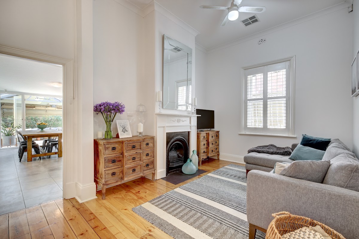 Inviting separate lounge room leads to a superbly renovated open plan kitchen/dining room with Caesarstone benchtops, soft close drawers, Smeg cooking appliance and fisher & Paykel dishwasher. Two spacious bedrooms both with built-in robes and main with open fireplace. Modern central bathroom, full size renovated laundry, and second separate w/c.