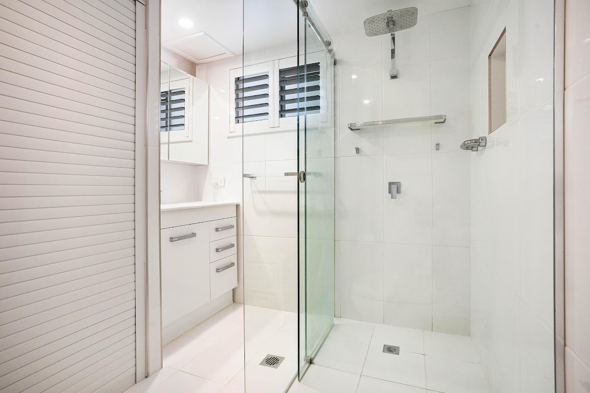 The beautifully renovated bathroom was carefully designed with floor to ceiling tiles, mirror storage cabinetry, vanity, toilet, and the convenience of pull-down shutter to hide the laundry away when not in use.