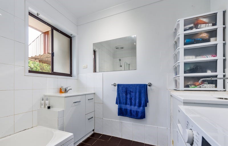 The combined bathroom and laundry includes a shower/bath and ample storage space for convenience.