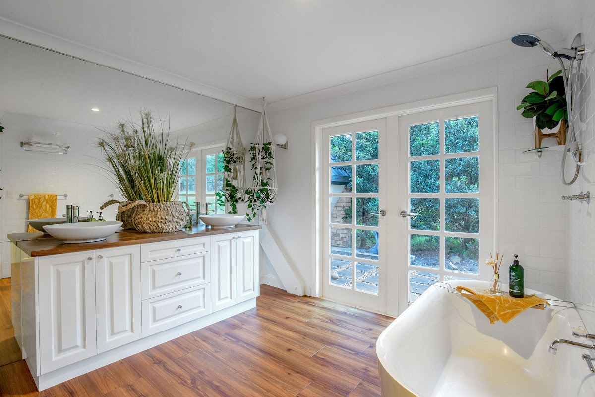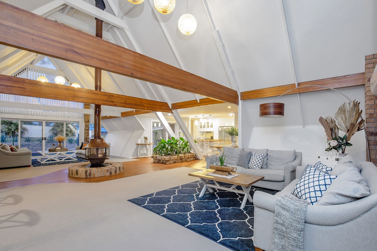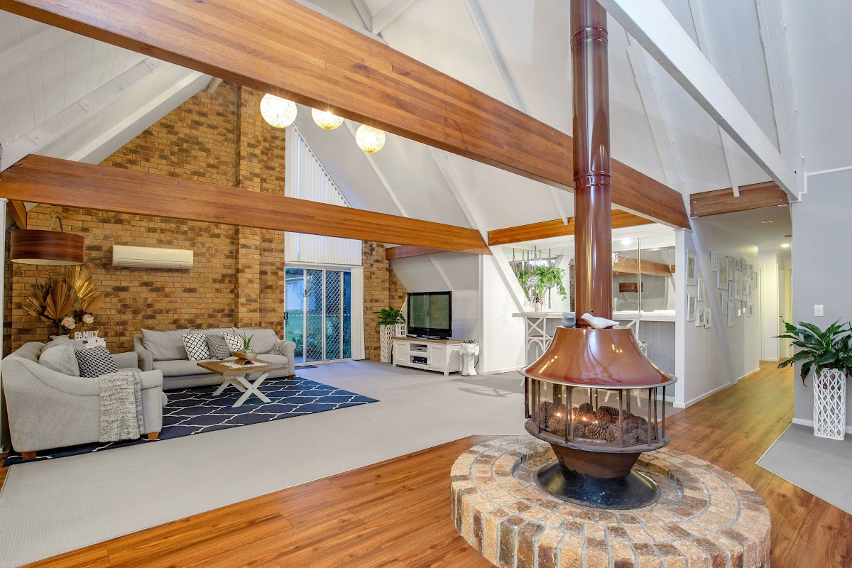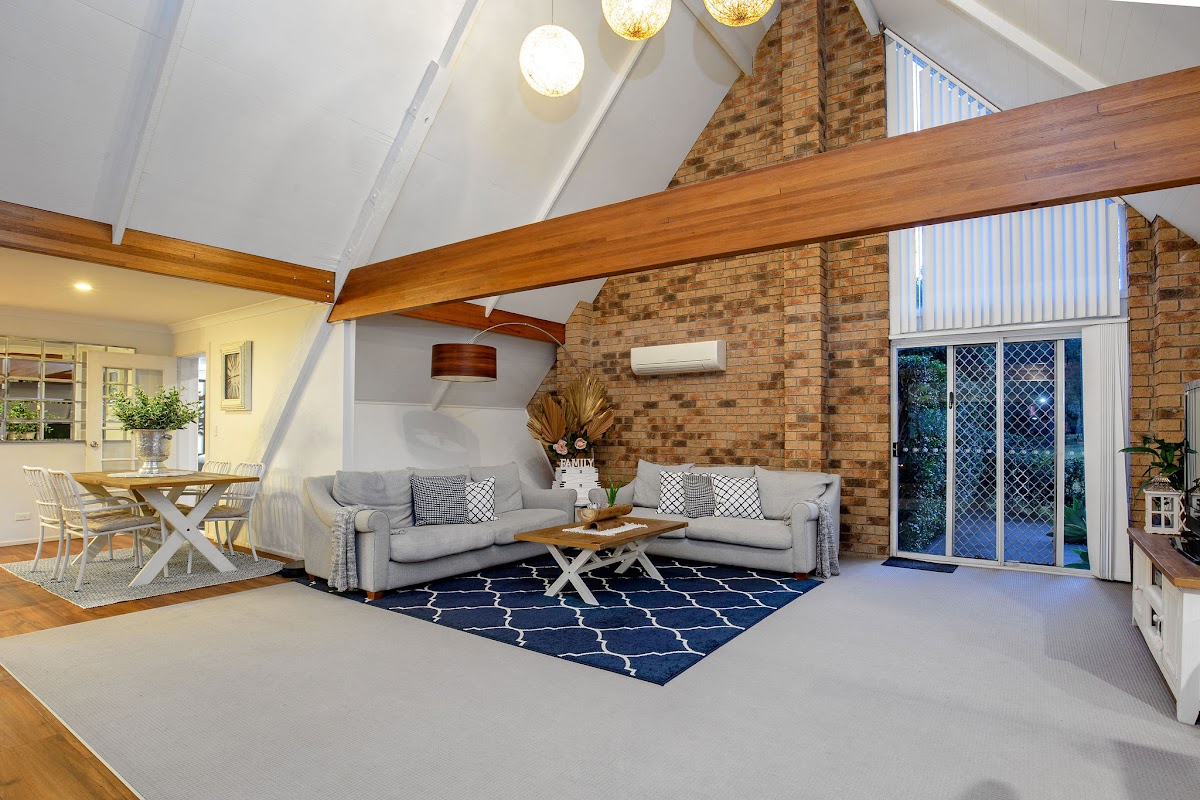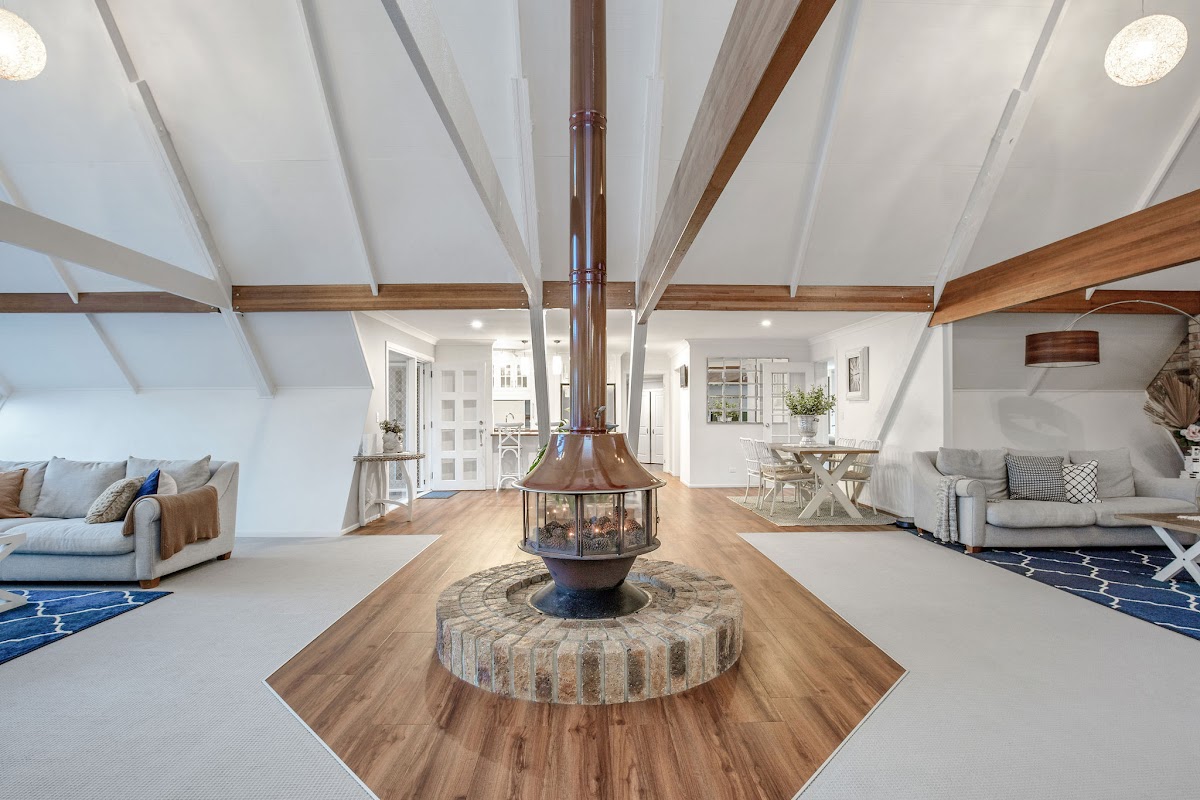 This Hamptons inspired property with light filled, vaulted ceilings and exposed beams offers a stunning home for a large family.