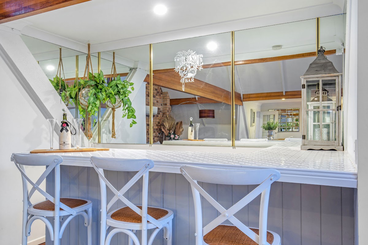 The inviting lounge with central decorative fireplace enjoys a view to the pool area and provides a welcoming entertainment area. Having guests over? Show your hospitality, with your very own, chic in-lounge bar.