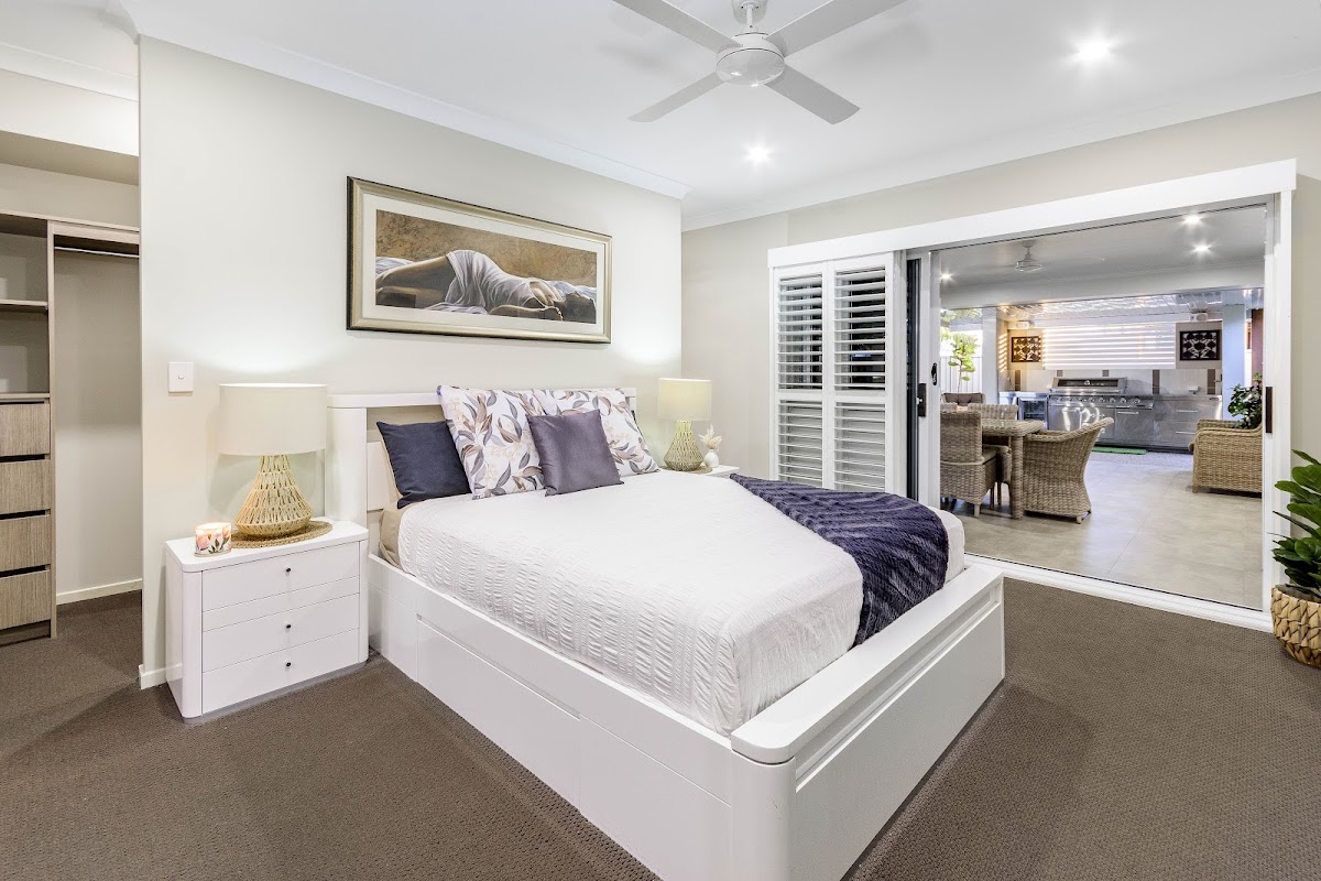 The main suite comprises a behind-robe, a generous open ensuite, and a separate toilet. You can sleep in the open air or draw the stacked shutters and doors for more privacy.