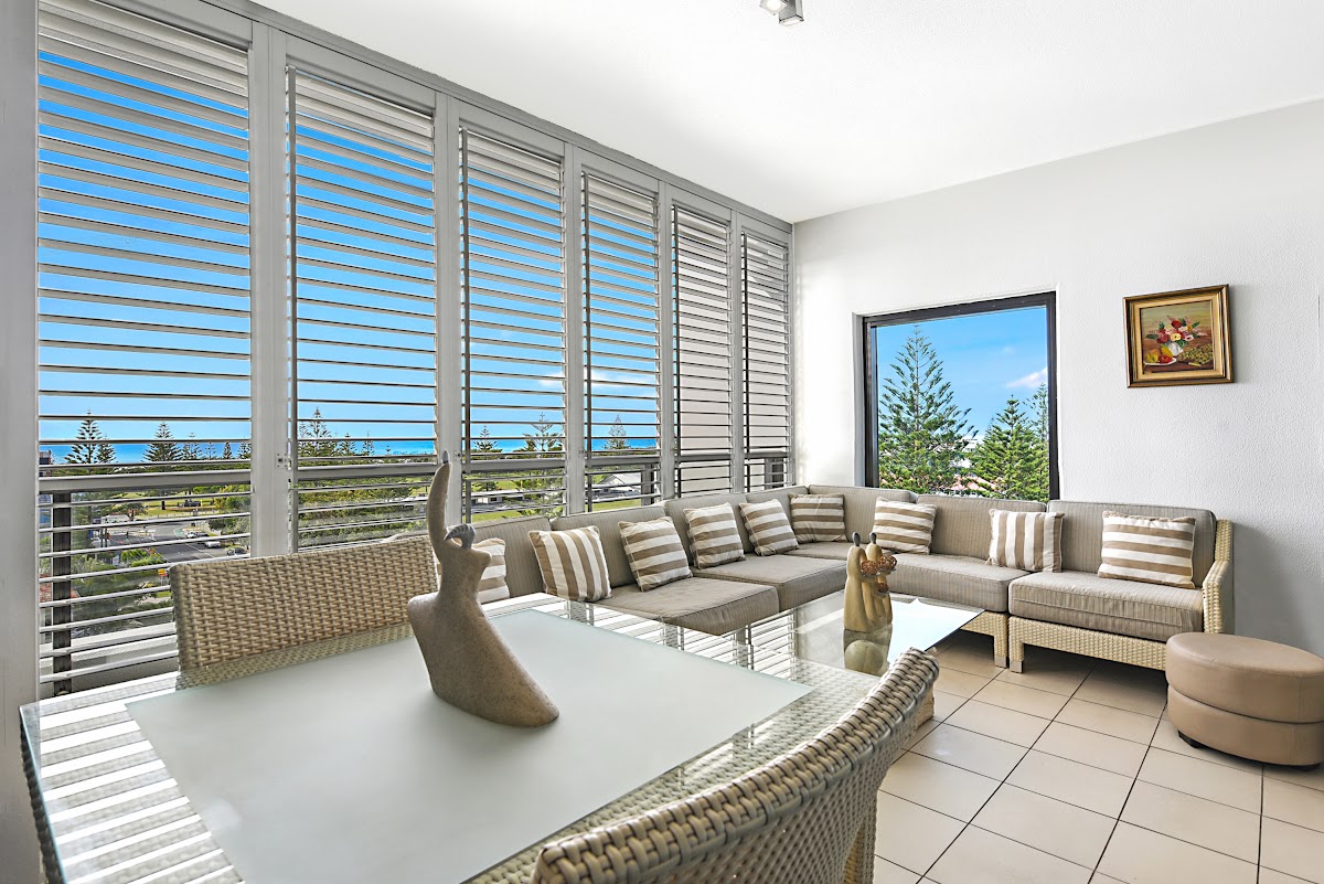 Light bright and airy with a modern open plan living area featuring windows that frame this perfect coastal outlook and doors that open out onto a large balcony fitted with plantation shutters adding an informal living space to an already generous-sized apartment. Perfect for relaxing and entertaining.