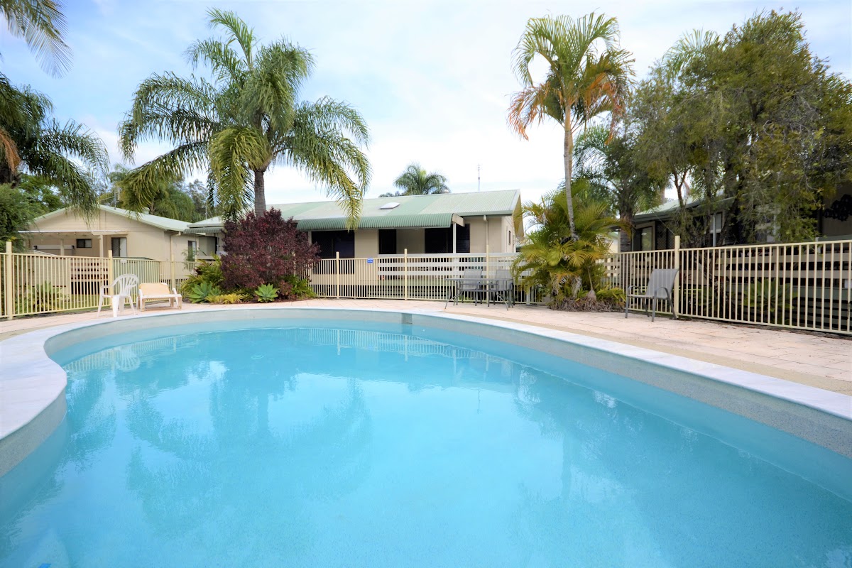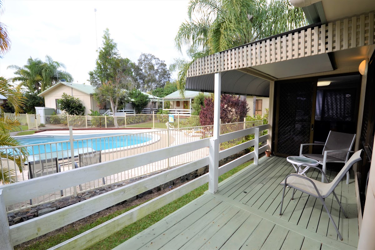 The home has air conditioning & ceiling fans. There is a lovely shady verandah to sit out and while away the hours, with an amazing view of the pool!! 2 good sized bedrooms with built-ins, large combined bathroom / toilet / laundry and an open plan lounge, dining & kitchen area. The dining room is an added extra area, making the home very spacious.