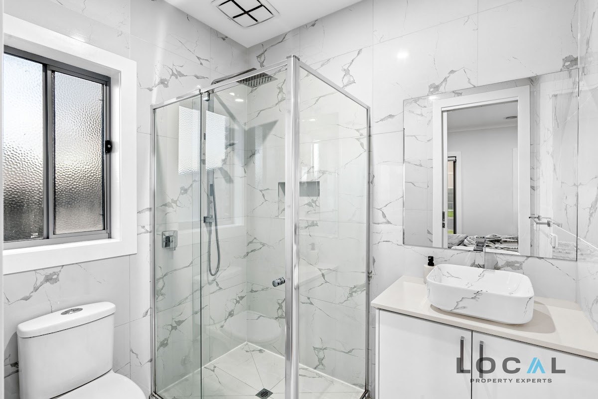 vanity, and upgraded tapware. The two additional bedrooms have built-in robes and are serviced by a sleek central bathroom, also featuring an extended shower for enhanced comfort and convenience.