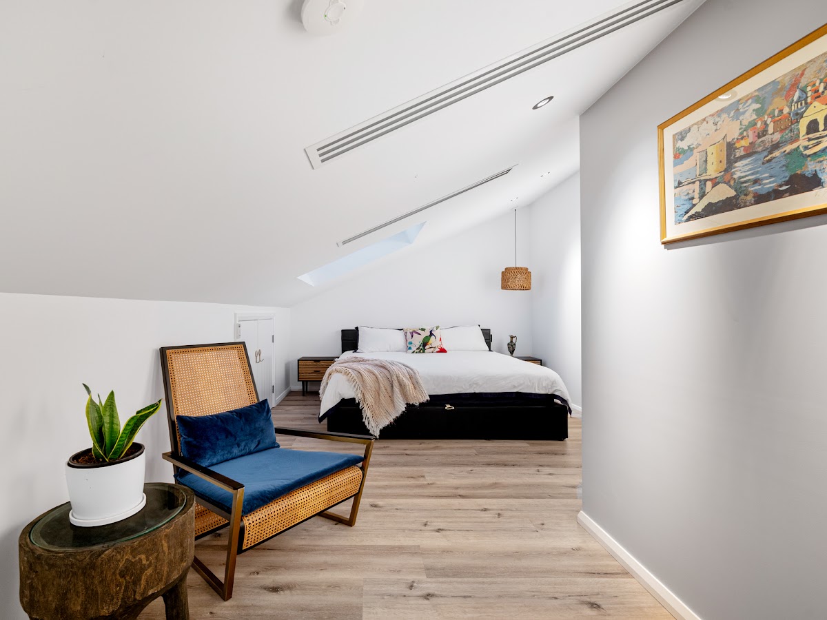 – Guest bedroom upstairs features a powder room, roof storage, bush views, skylight & office space