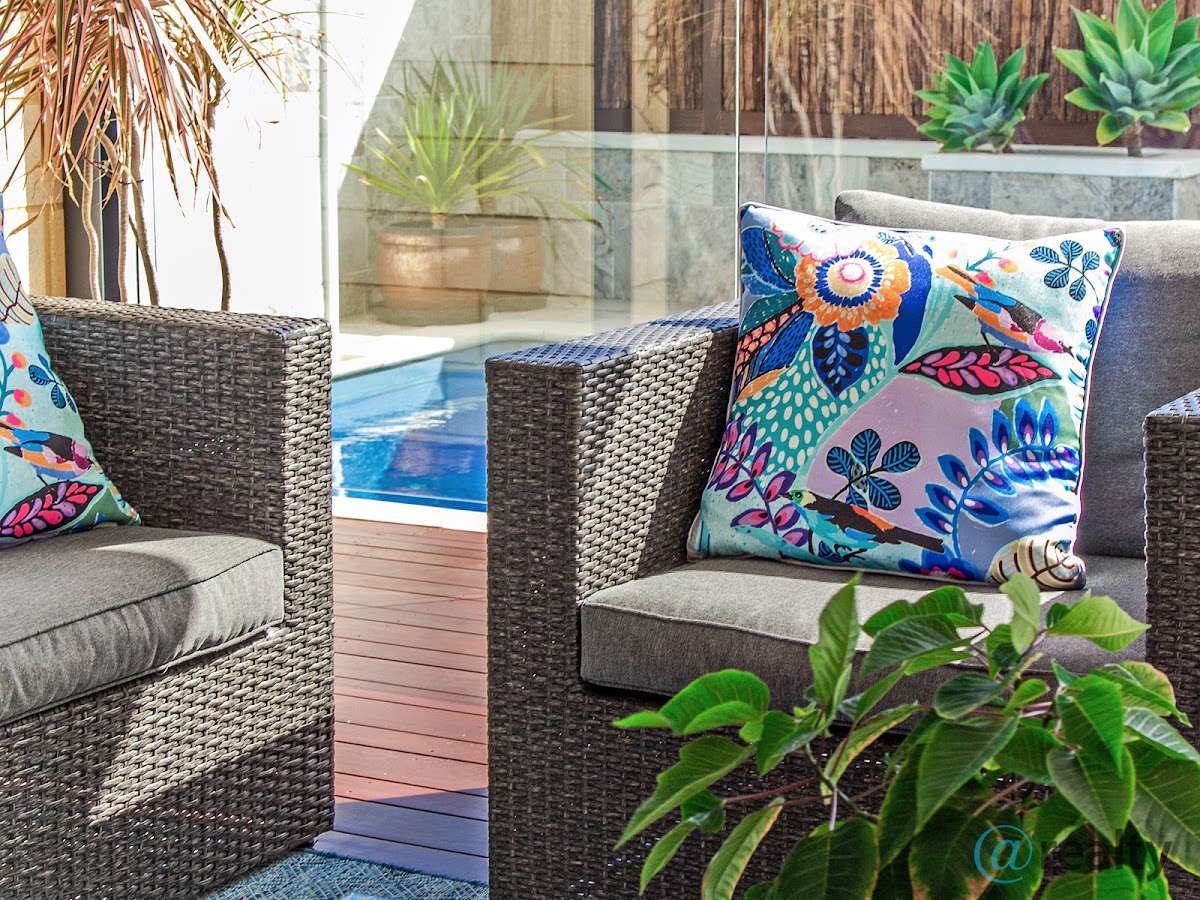 – Under main roof alfresco with stacker doors, cafe blinds & additional gable patio to side