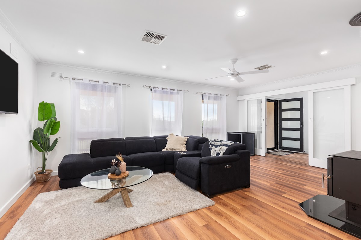 Floating timber floors, New Slow combustion heater and Ducted Reverse cycle Air-Conditioning complement this area.