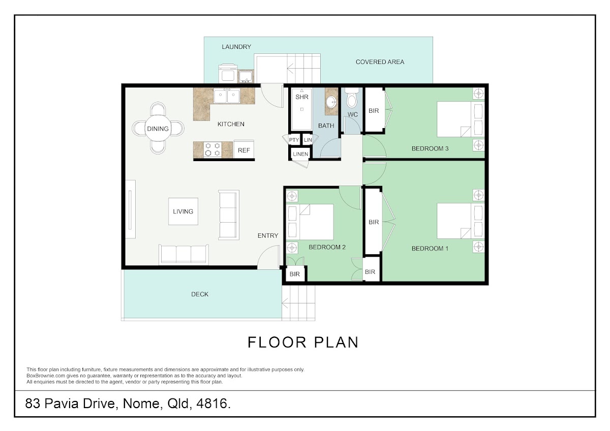 There are 3 bedrooms, all with built-in robes, a large living room that joins the kitchen and dining area, and a covered deck.