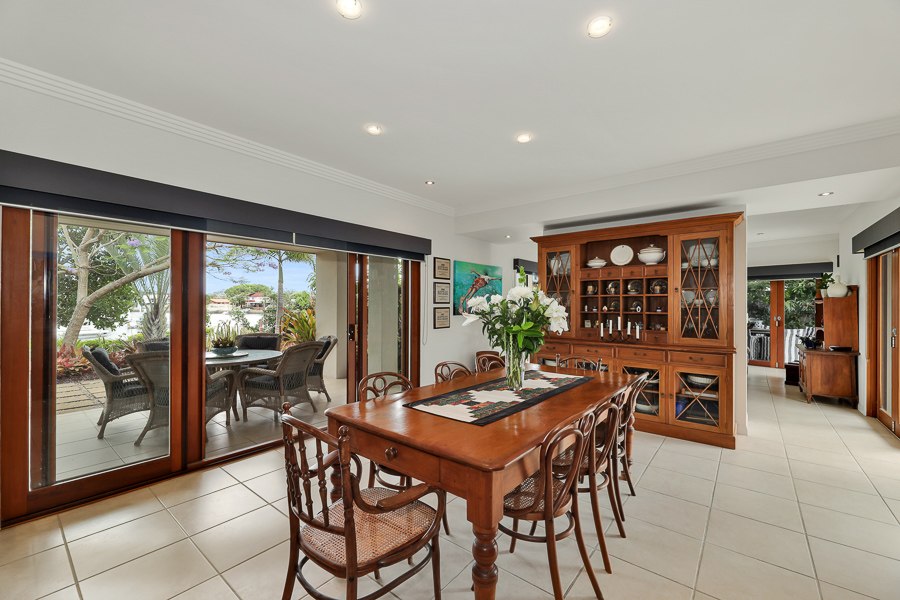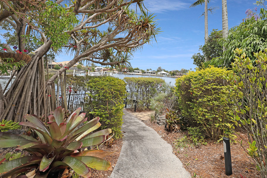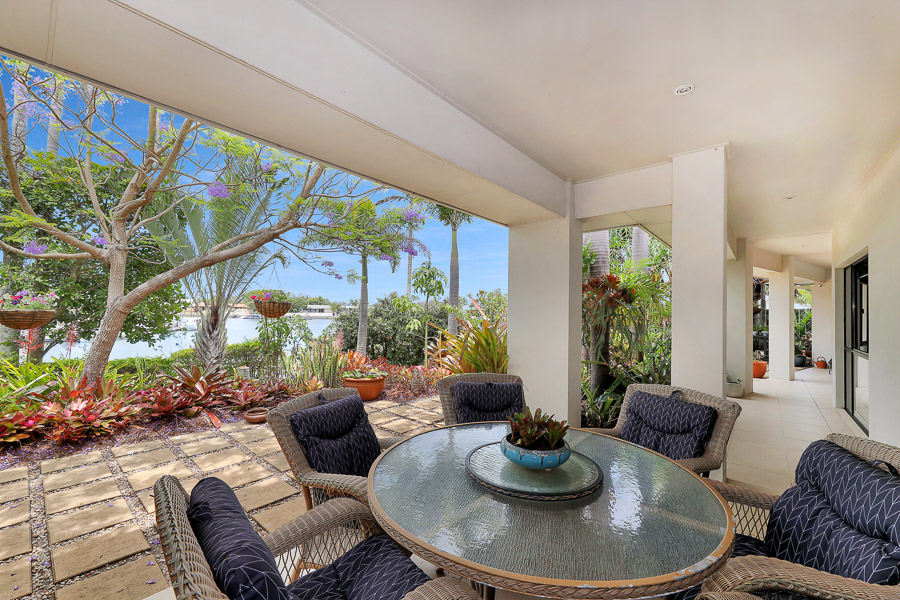 • Flowing out through bi-fold doors you will find a number of covered outdoor living areas with gorgeous professionally landscaped low maintenance gardens framing the best views, whilst the plantings offer privacy. A great place to sit outside with a glass of champers and watch the sunset and the family of dolphins play in the wide part of the canal.