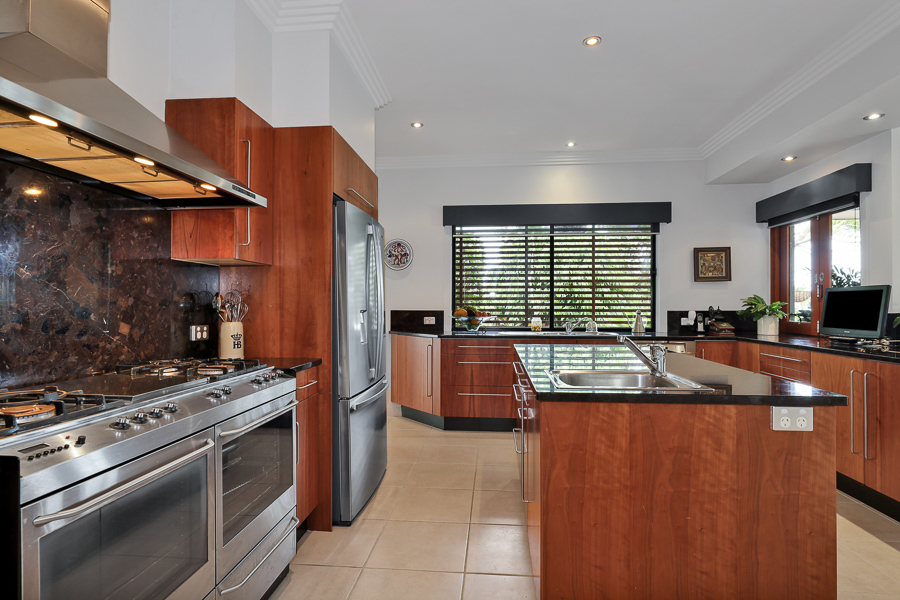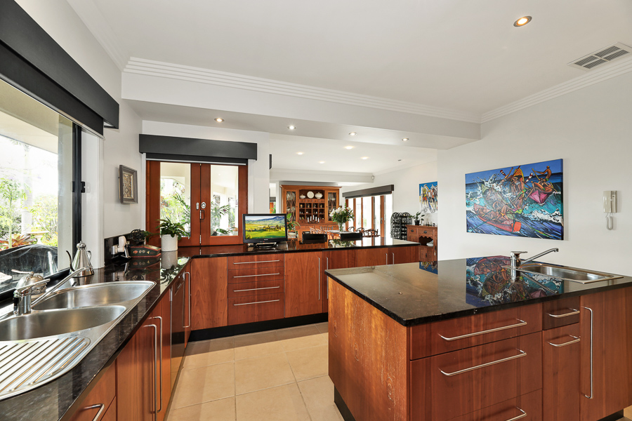 • In the kitchen you will find 3 sinks, sliding shelves and soft close drawers, plumbed fridge space, exclusive AAA classified Italian ‘Marron Glace’ natural granite to bench tops and splashback, butler’s pantry and a bifold window leading to the outside BBQ area.