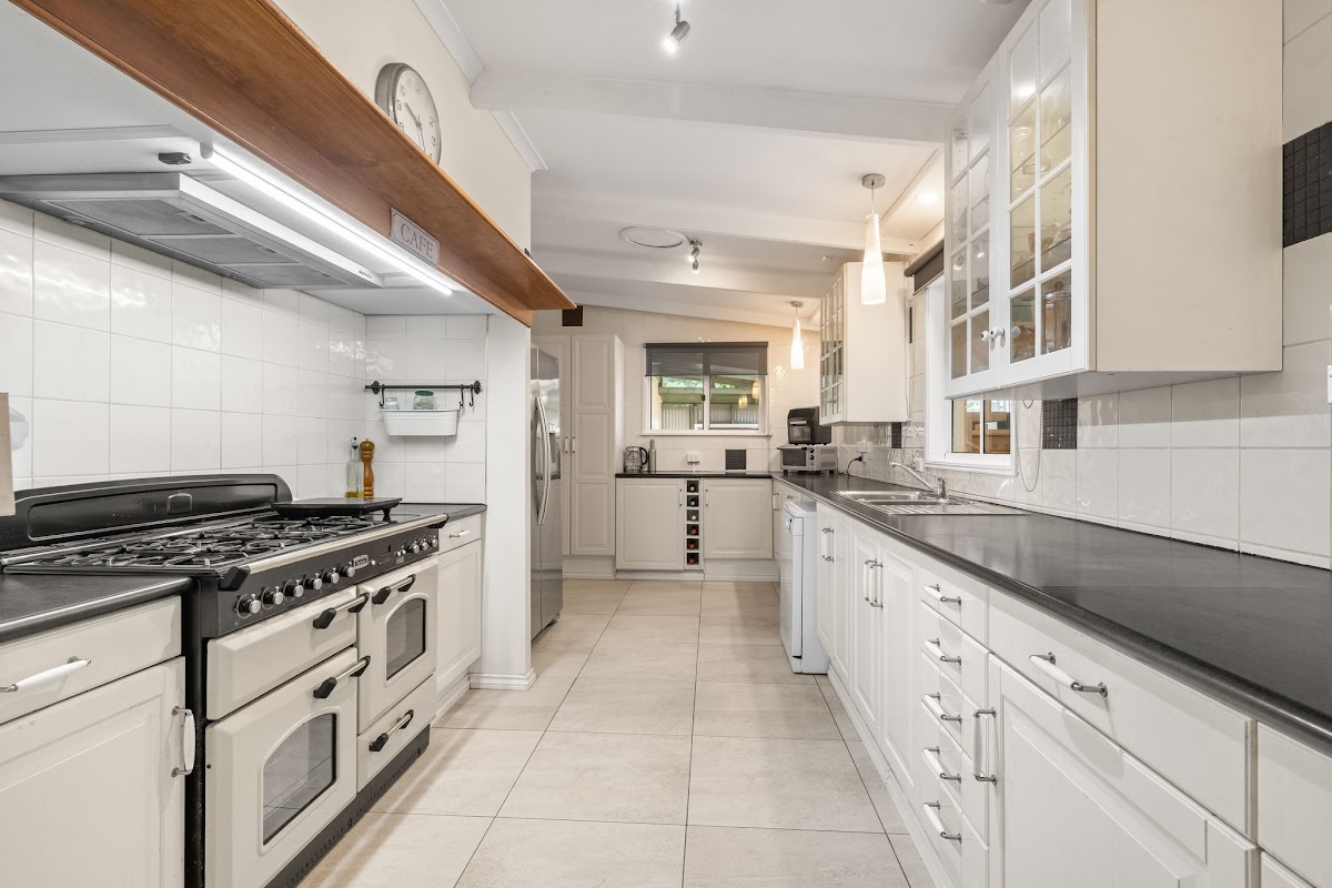 The low-set stone home, constructed with core-filled Besser block external walls, provides solid, low-maintenance living. A spacious air-conditioned lounge with tiles throughout and fireplace opens via sliding doors to the outdoor patio, while the galley-style kitchen features a Falcon oven with extraction fan, dishwasher and pantry.
