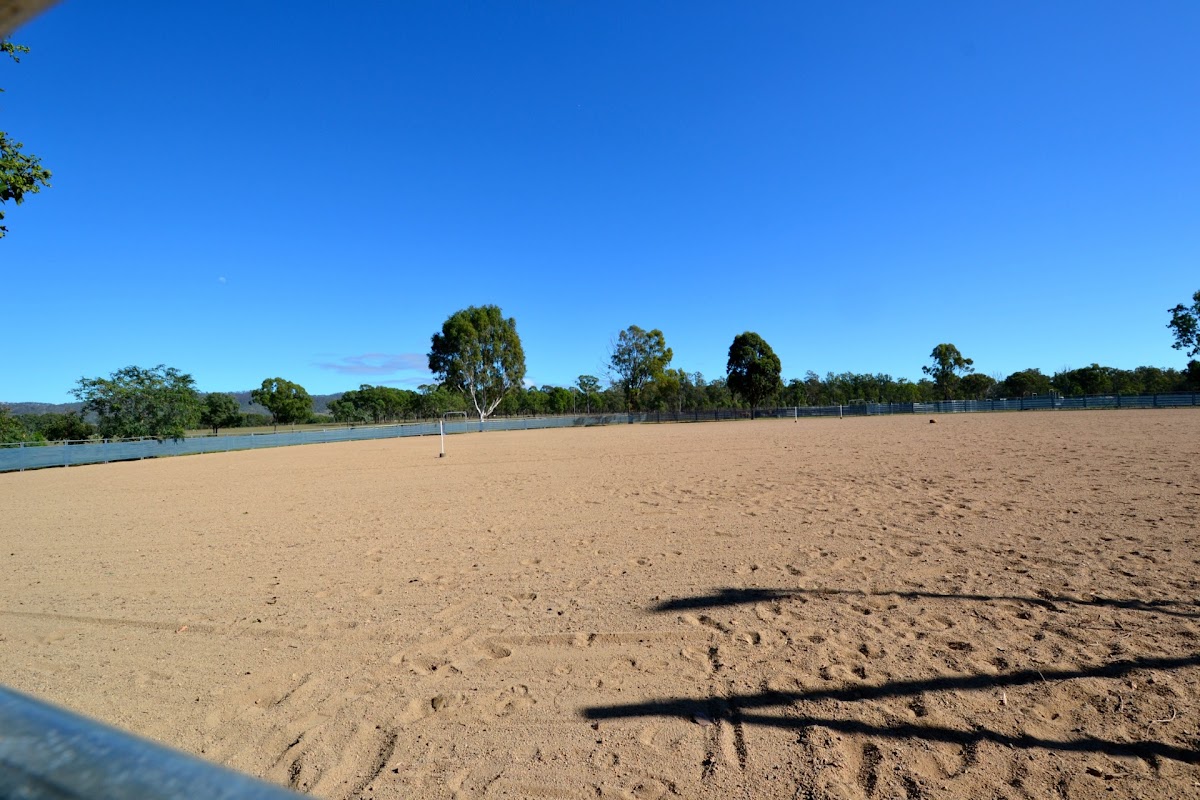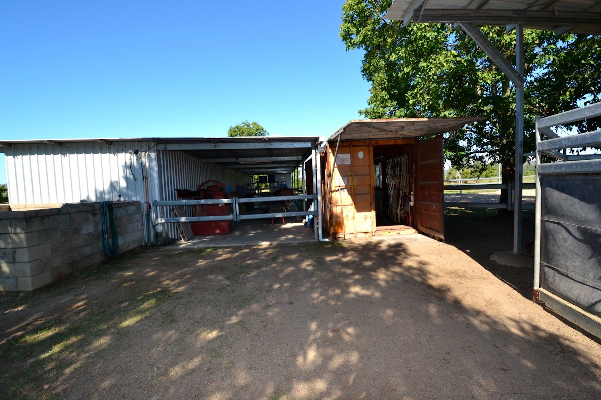* Under cover Rubber lined round yard adjoins the Saddle Storage 20′ Container, Fenced Breezway for Hay / Feed , Wash Bay and 4 Walk in Stalls and steel yards, fantastic tie up area , Vet Crush with non slip concrete floor and Shade Trees.
