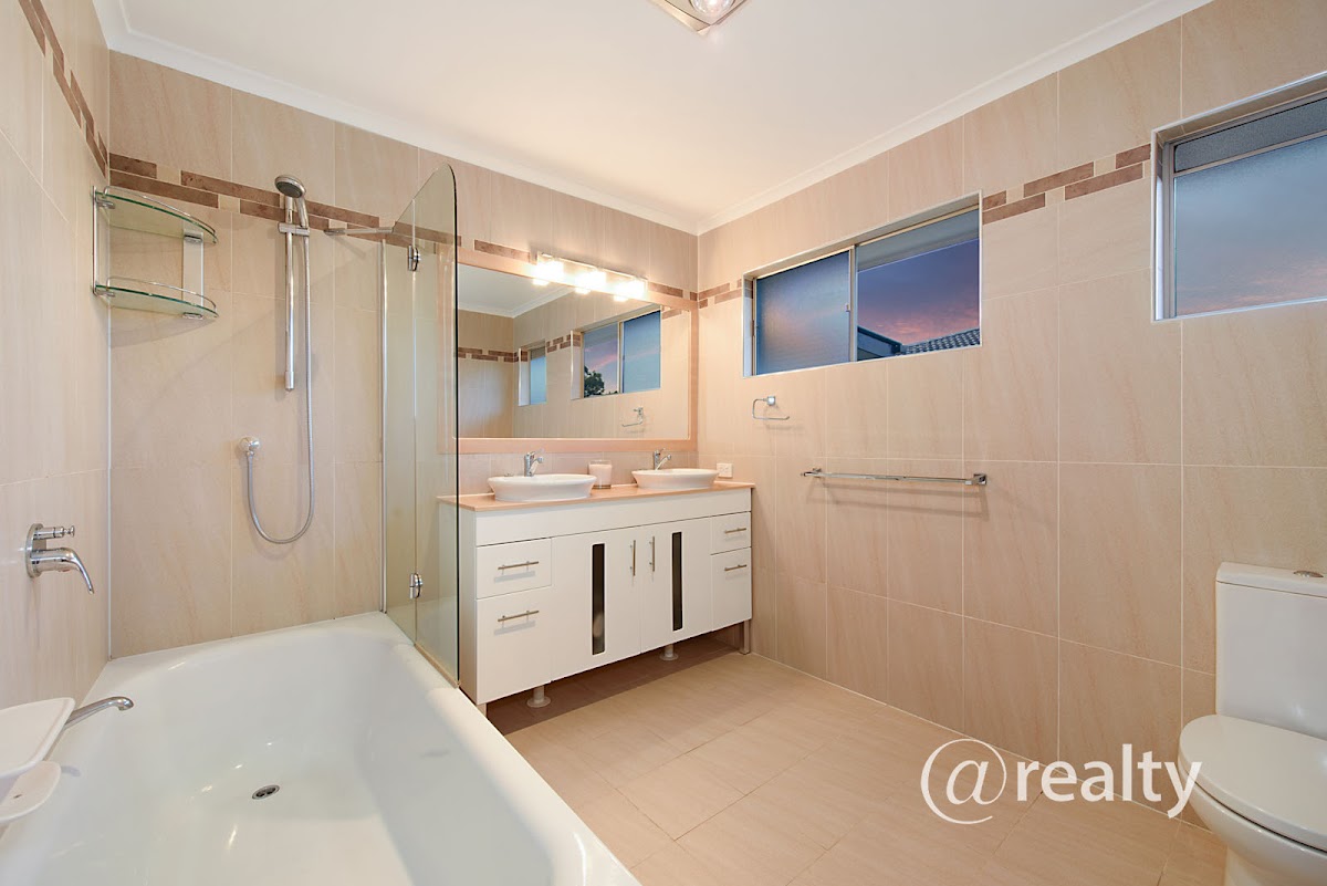 * Gorgeous renovated main bathroom with a stone bench his & hers vanity and floor to ceiling tiles
