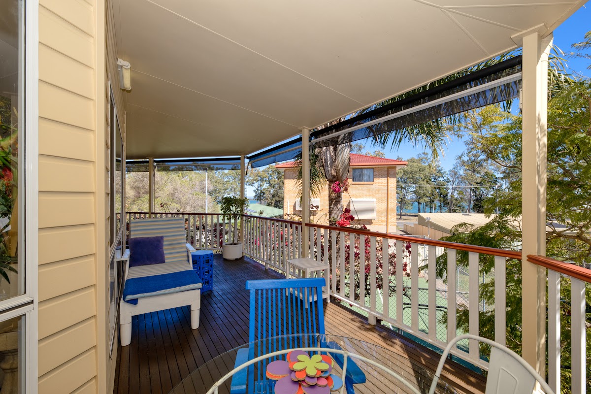 Featuring open plan living areas with cathedral ceilings upstairs leading out to a wide breezy verandah to the rear of the home with water views, this is an ideal spot to entertain family and friends or relax after a hard day. Lots of entertainment here, a half tennis court graces the back yard and can be used for tennis or pickle ball.