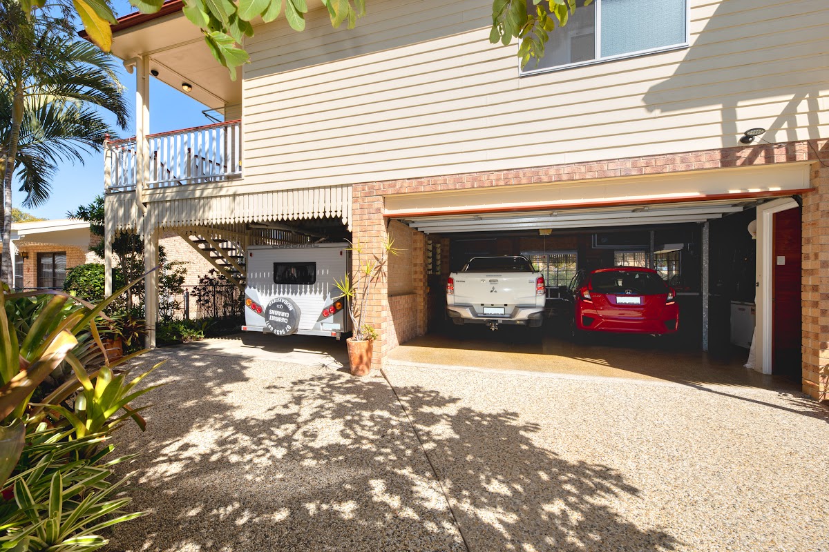 The home has three bedrooms, open plan living/dining/kitchen, two bathrooms and double garage. The large master bedroom features a large built-in wardrobe and en-suite with the other two bedrooms having built-in wardrobes. All living is upstairs with the double garage, workshop, covered space for the pop-top van or boat and lots of covered entertainment areas downstairs. Look at these additional features: