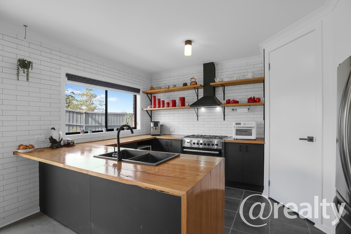 At the heart of the home is a striking kitchen that will impress the home chef, featuring elegant black cabinetry, wood benchtops with natural live edges, a double sink, quality stainless steel appliances including a 900mm gas cooktop, electric oven, dishwasher, and space for a double-door fridge.