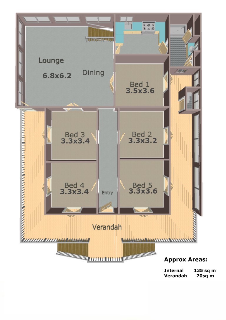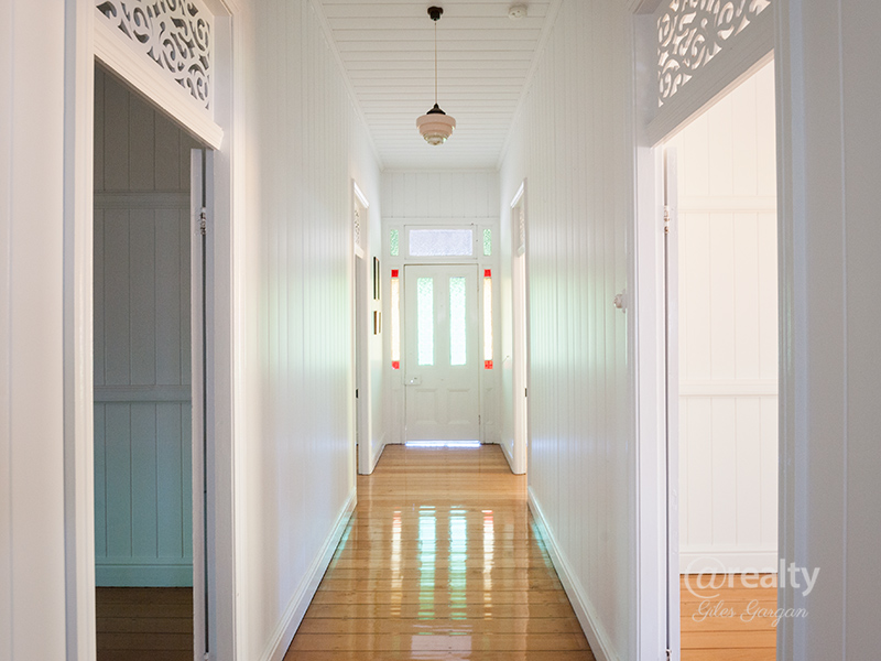 The house itself comprises of 5 bedrooms, 4 of which have stained glass French doors that open onto the verandah. The family/dining room, located to the rear of the property was originally the back verandah, and is now an expansive family room with an air conditioning unit and two fans. A family bathroom with separate toilet, kitchen and laundry alcove complete the upstairs.