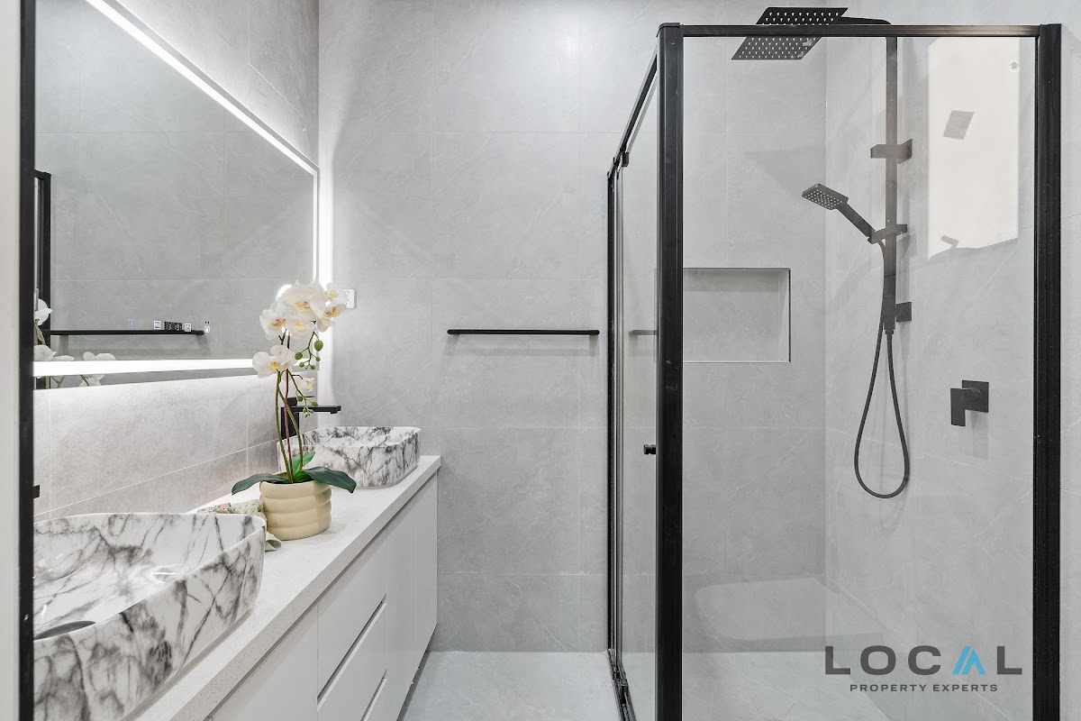 The home offers three bedrooms and two beautifully finished bathrooms. The master suite is a true luxury retreat, featuring a generous walk-in robe and a high-end ensuite with floor-to-ceiling tiles, double vanity, LED mirrors and premium tapware. The remaining bedrooms are well-sized and serviced by a central bathroom that also features floor-to-ceiling tiles, an upgraded vanity, modern fixtures and a sleek freestanding bathtub.
