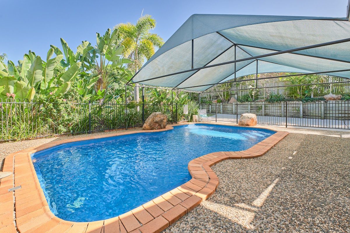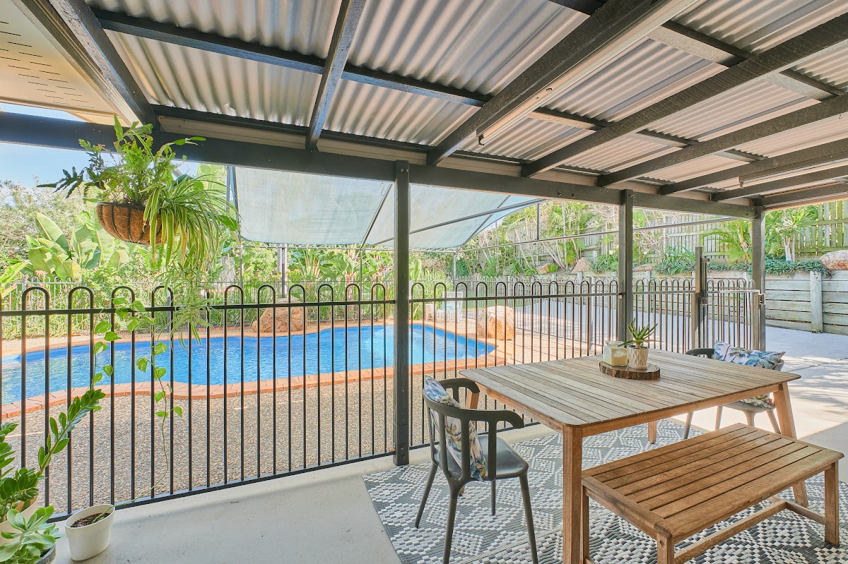 overlooks the inground pool that has a shade cloth cover