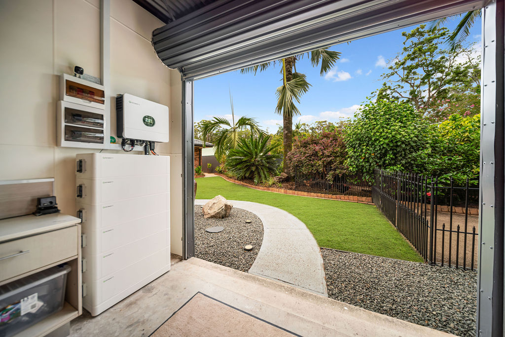 What sets this home apart is its ingenious off grid design. Installed in 2023 – 8KW of solar panels on the shed with a 6KW OFF GRID Inverter and 6 x 50 AH Growatt lithium batteries (total 15.35kw/h storage) which feeds back to the main house.